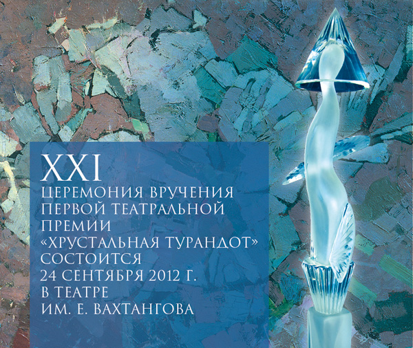 Новогодний бал «Хрустальной Турандот» «С Новым годом, Театр!» Вас ждет хозяйка бала принцесса Турандот — Нонна Гришаева, а также В. Зельдин, Е. Князев, Ю. Рутберг, Ю. Пересильд. Билеты можно купить здесь и здесь.Спектакли-лауреаты премии разных лет: «Дядя Ваня», «Рассказы Шукшина», «Мальчики» Декабрь 2012 — Январь 2013