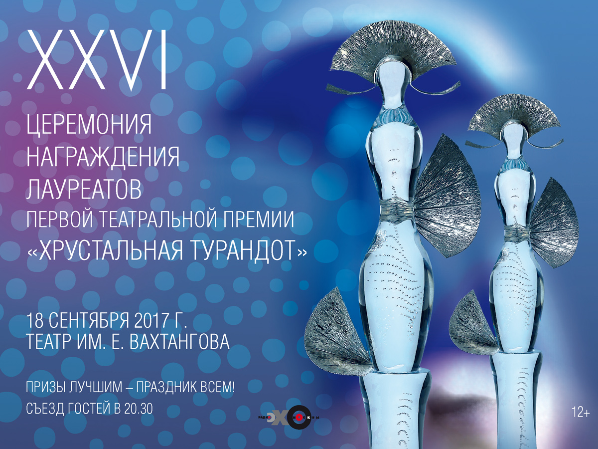 XXVI церемония награждения лауреатов театральной премии «Хрустальная Турандот». 18 сентября в Театре имени Евг. Вахтангова награды получат лучшие театральные премьеры 2016/2017