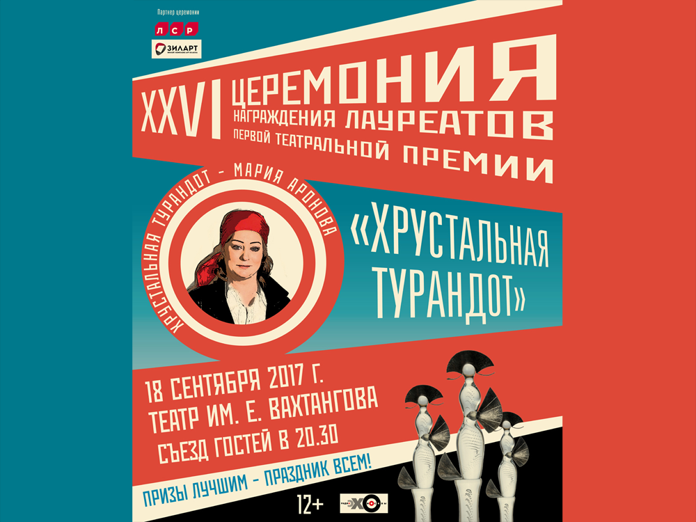 Ведущая церемонии — Мария Аронова.«Хрустальная Турандот». XXVI церемония награждения лауреатов 18 сентября 2017 года в 20:30, театр им. Евг. Вахтангова